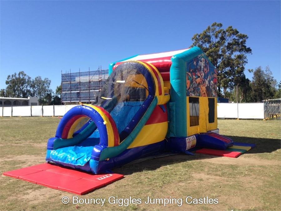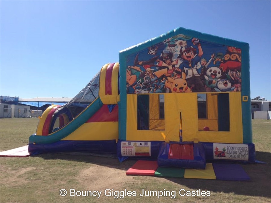 Forget about having to chase these crazy critters all over the neighbourhood for the day and let your kids burn off their energy jumping around in our Pokemon jumping castle instead! Watch them as they have loads of fun jumping and shooting hoops and then racing up the dual lane climb wall up to the huge dual lane slide which exits to the left side of the castle.