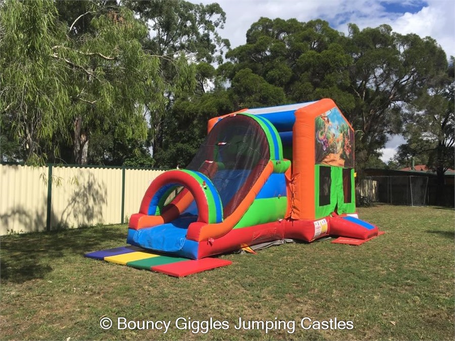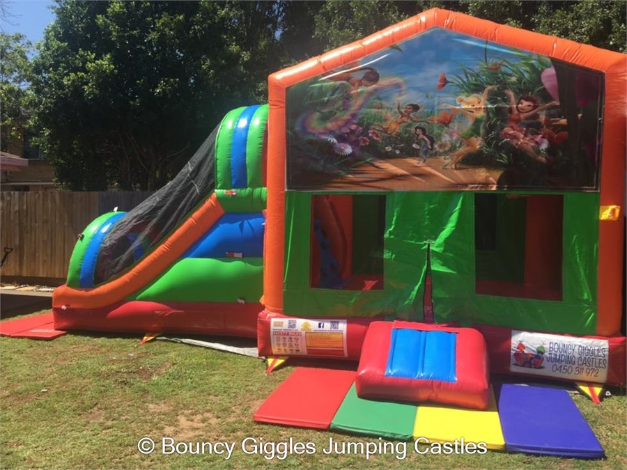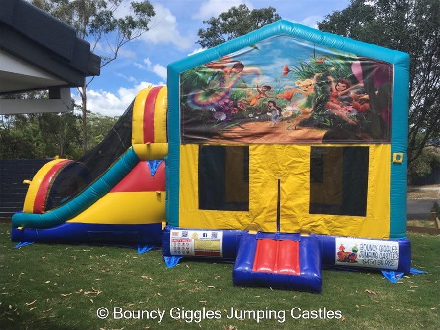 TinkerBell and her fairy friends are all set to party! This castle features a jumping area for the kids to bounce their hearts out and a hoop to challenge each other to a shoot out! From the Jumping area they can climb the double lane climb wall and slip and slide down the double lane width slide! It also has a shade/rain cover to protect your little ones from the elements. Perfect for toddlers through to 12 years old.