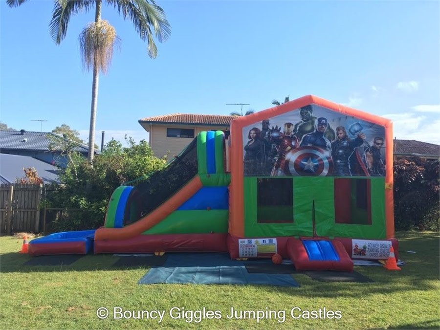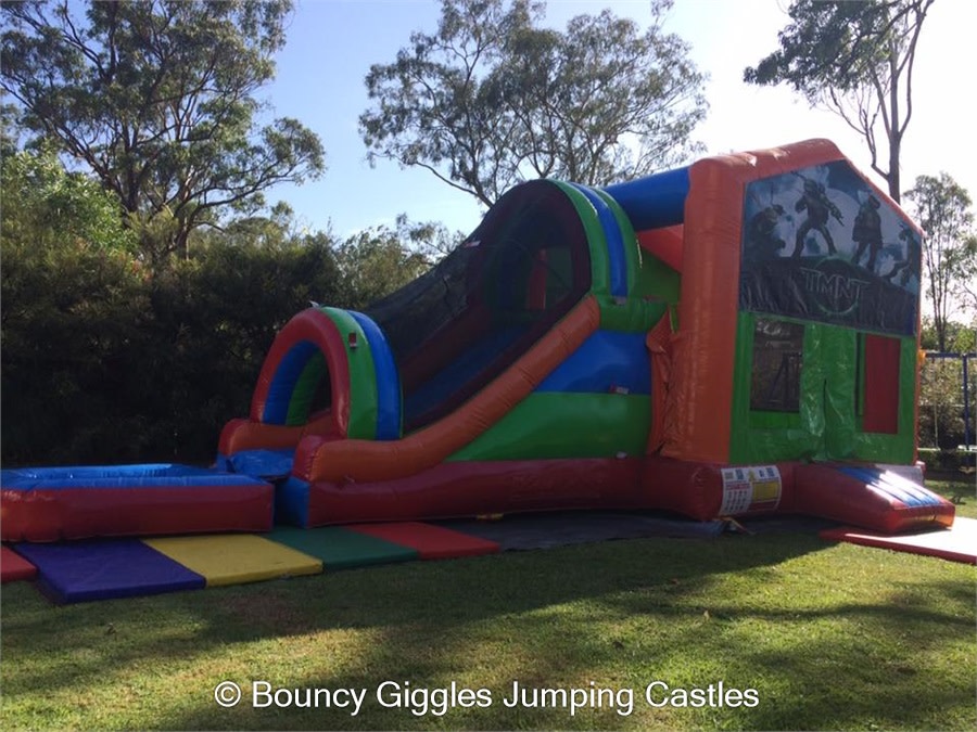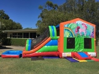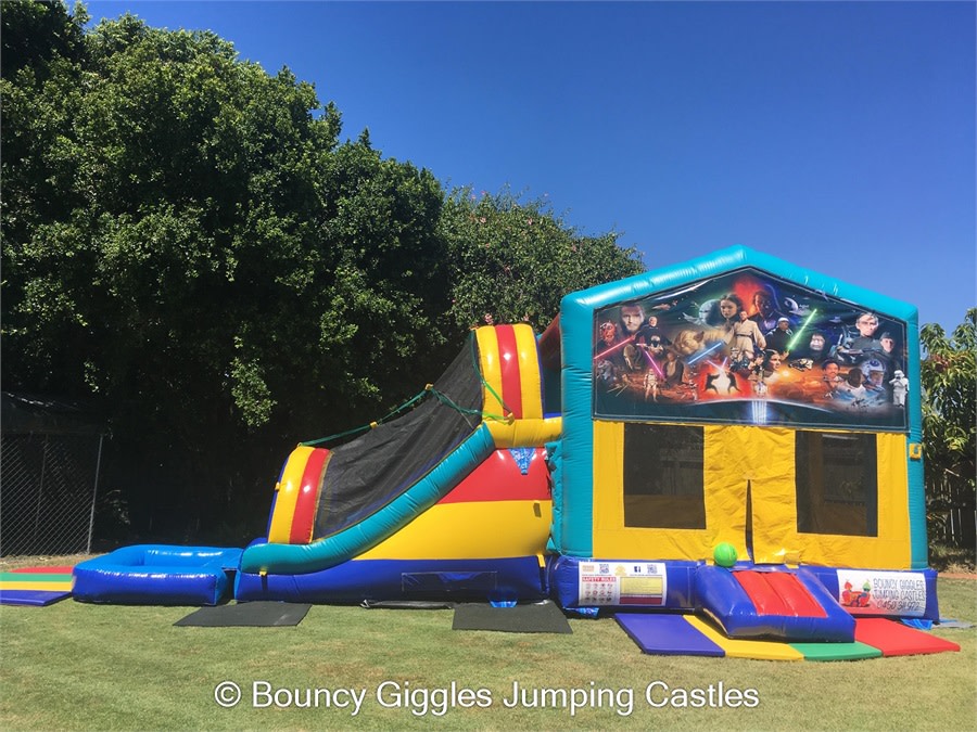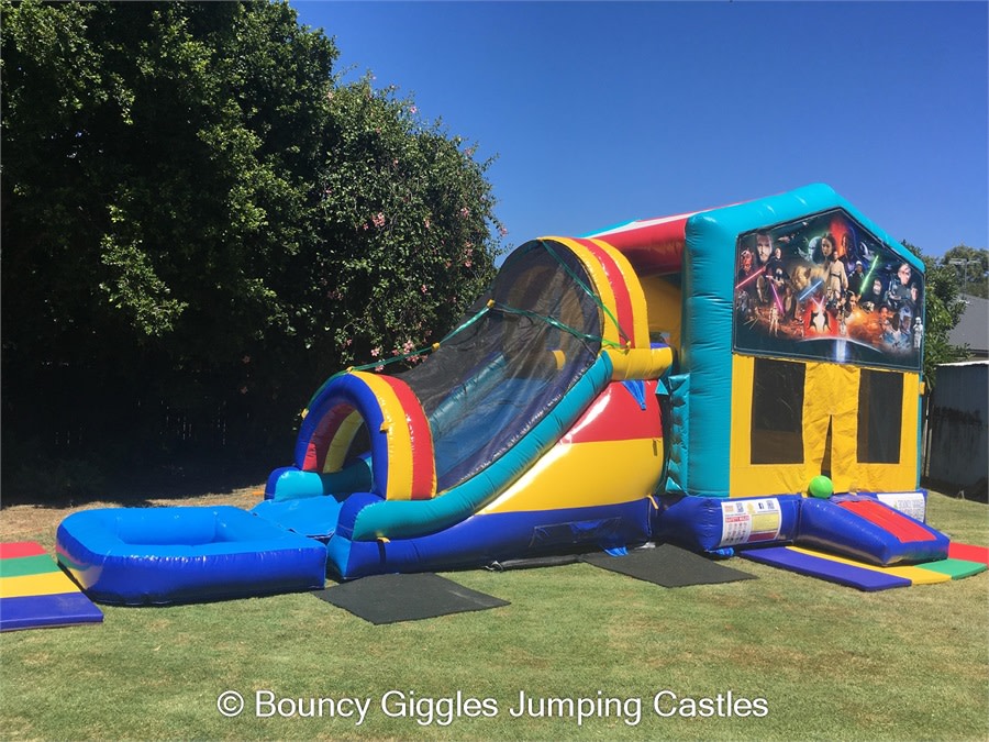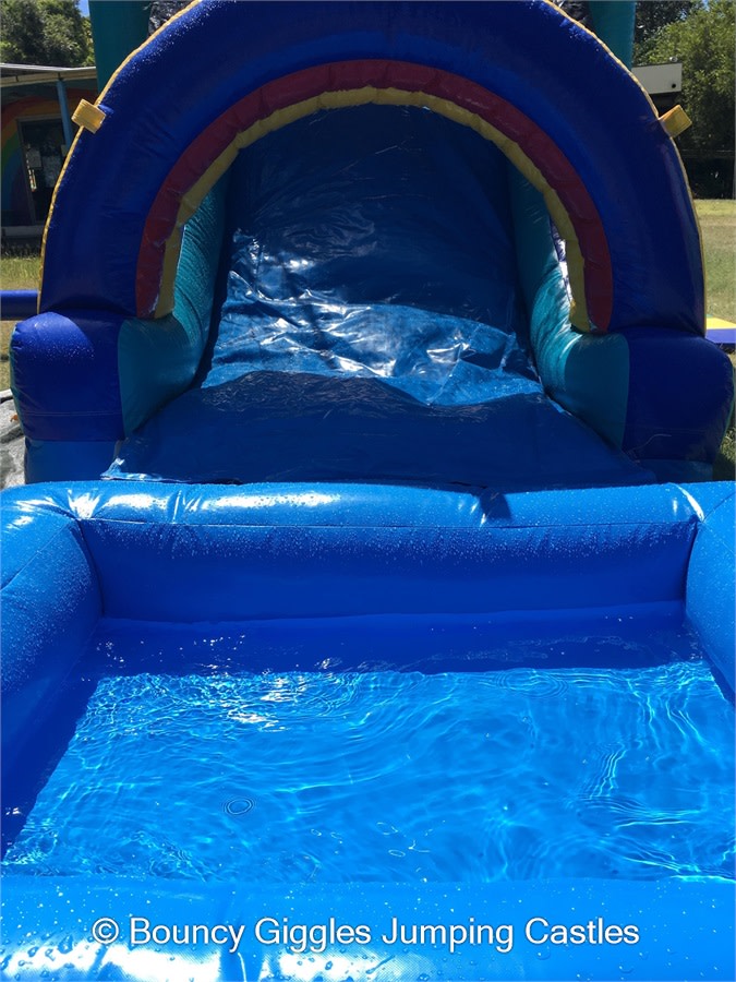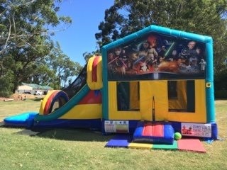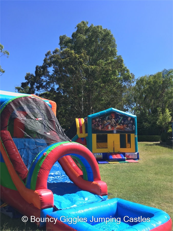 You have slip and slides where the kids take a run up and slide for a few minutes down a track- then you have jumping castle waterslide mega combos! For the same price as most slip and slides you can hire our Waterslide Jumping castle and the kids get the added entertainment of a jumping area with a hoop to slam dunk all day long, race up the dual lane climb wall and slip and slide down the dual lane slide into the pool at the base. These come in a variety of different themes including Teenage Mutant Ninja Turtle,Unicorns and Rainbows, Pokemon, TinkerBell, MineCraft, Star Wars, Justice League, The Avengers and Minions! Please contact us to make a booking for a waterslide.